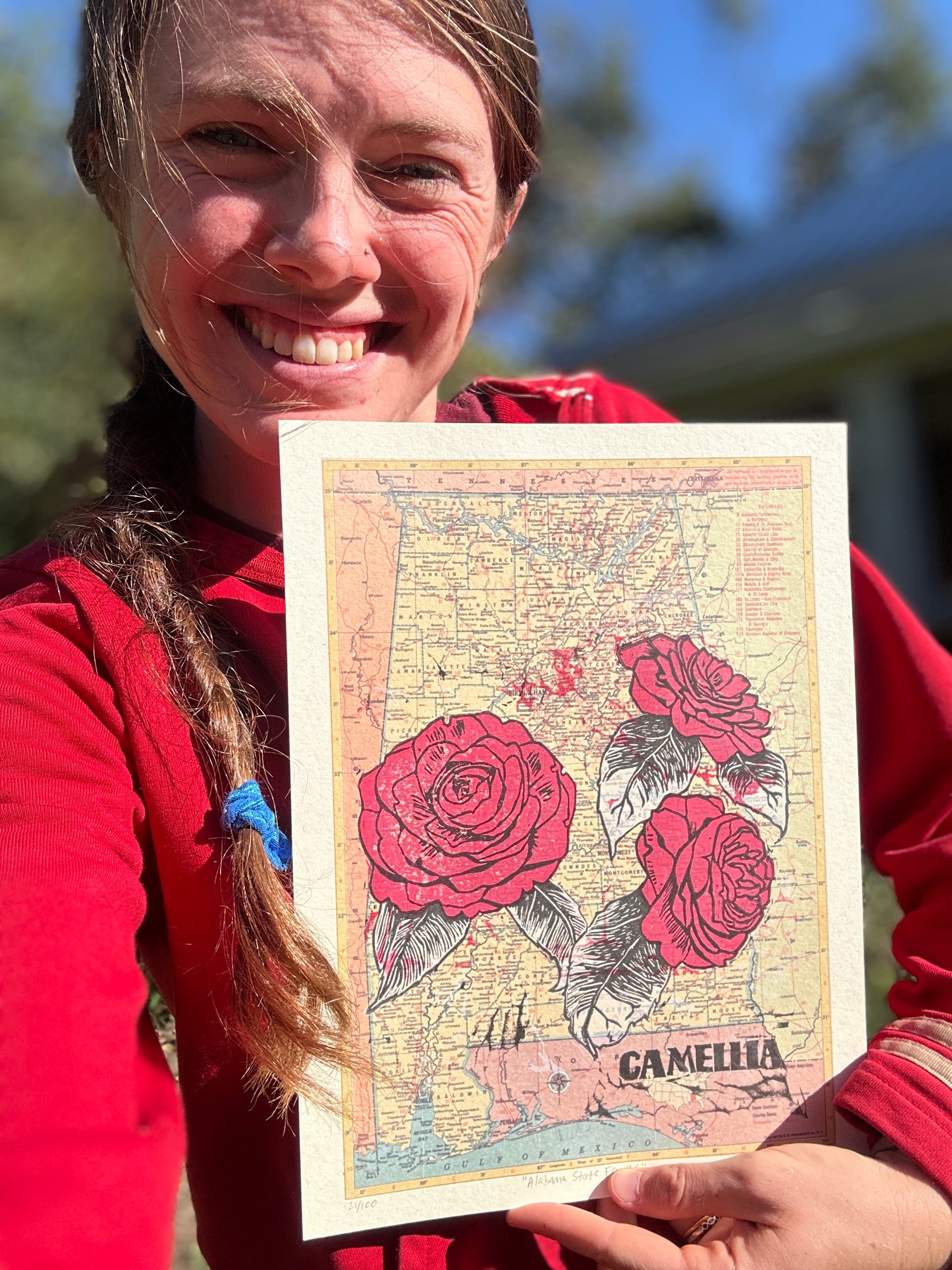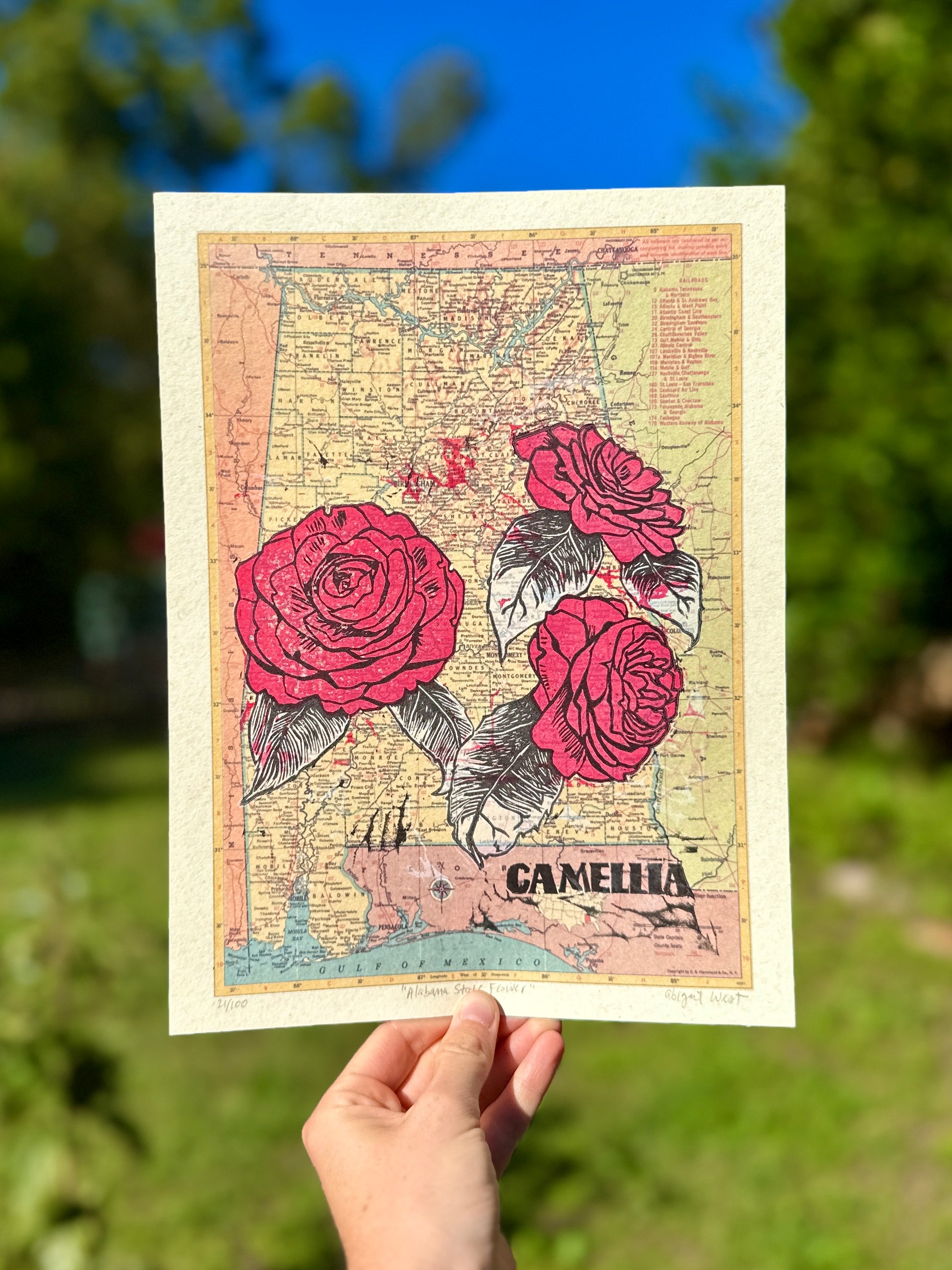 Alabama State Flower Linocut - Camellia on vintage AL map