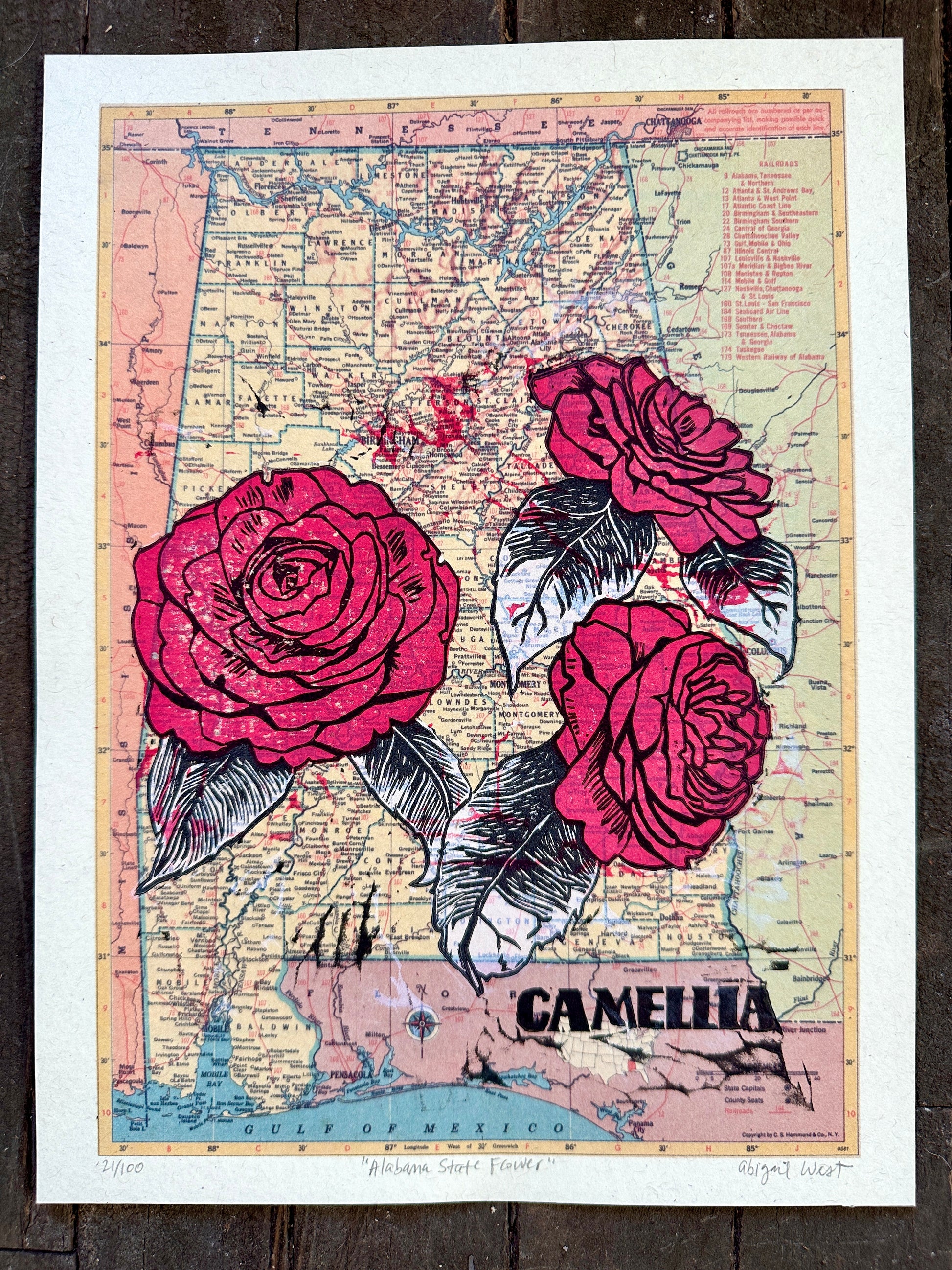Hand-carved, hand-printed three layer linocut of Camellias, the Alabama State Flower. Printed on a 1950s era vintage atlas page.