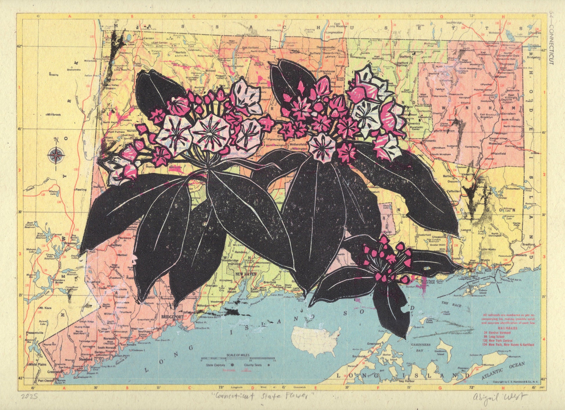 Connecticut State Flower (Mountain Laurel) Linocut on Vintage Map
