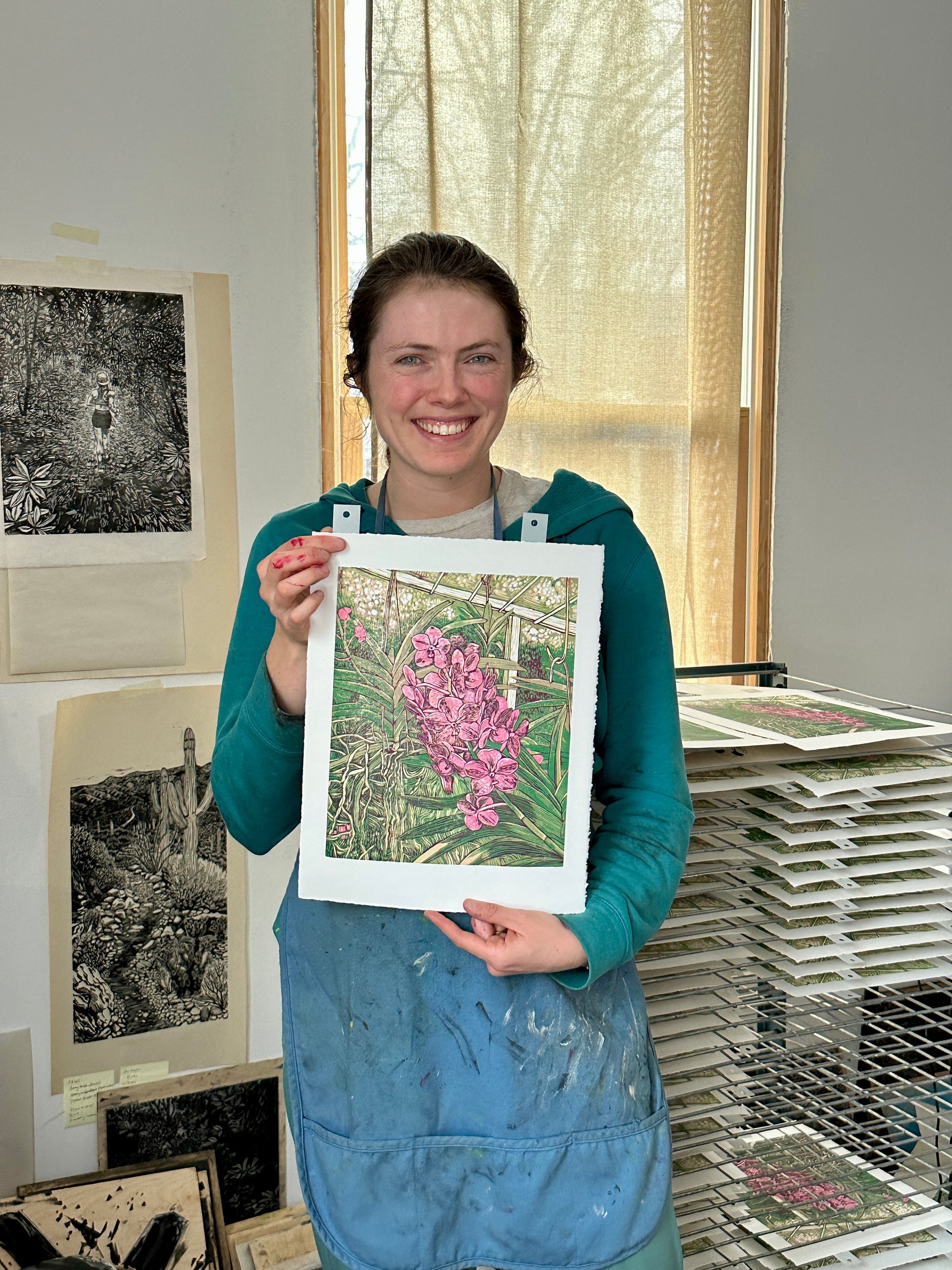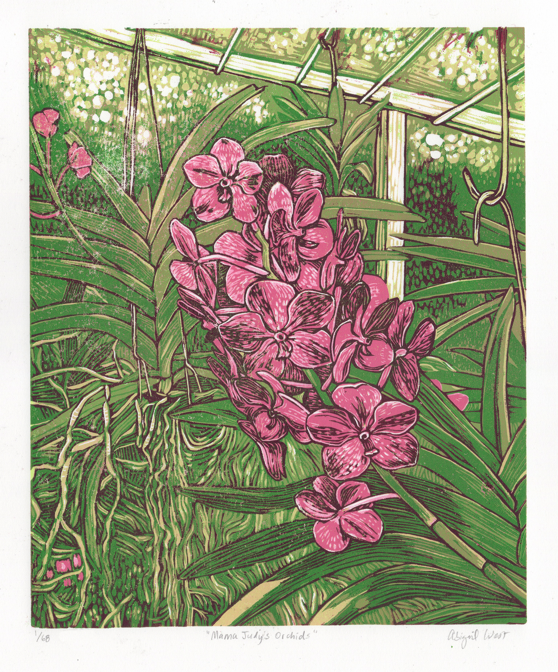 This 6-layer reduction print portrays a bright pink Vanda, one of my grandmother's (known to us grandchildren as Mama Judy) favorite types of orchids.