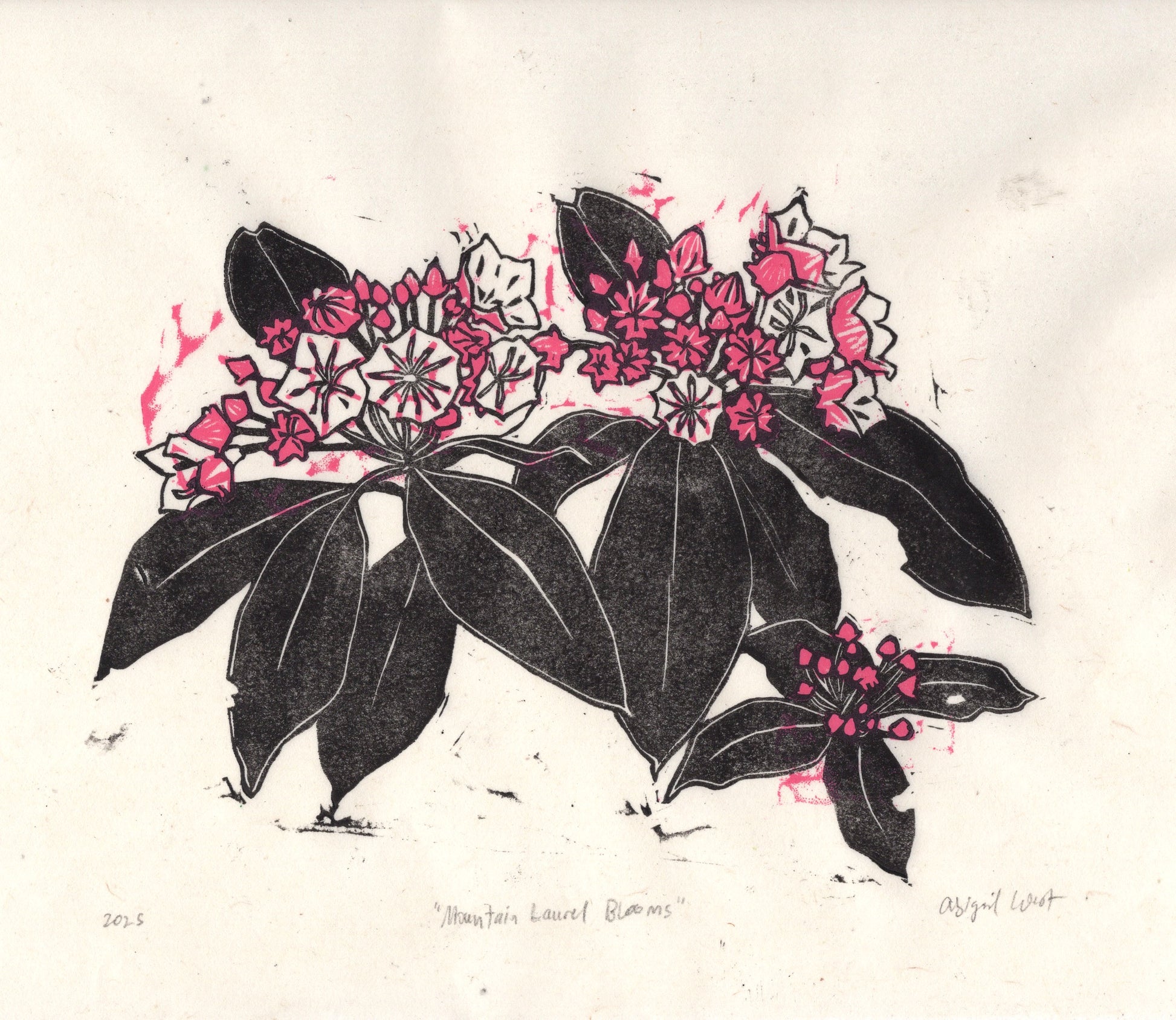 Simple mountain laurels in bloom. Printed on Thai Kozo, 9x12".