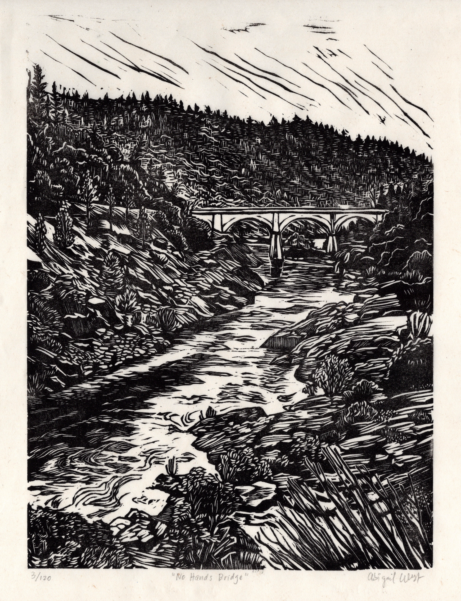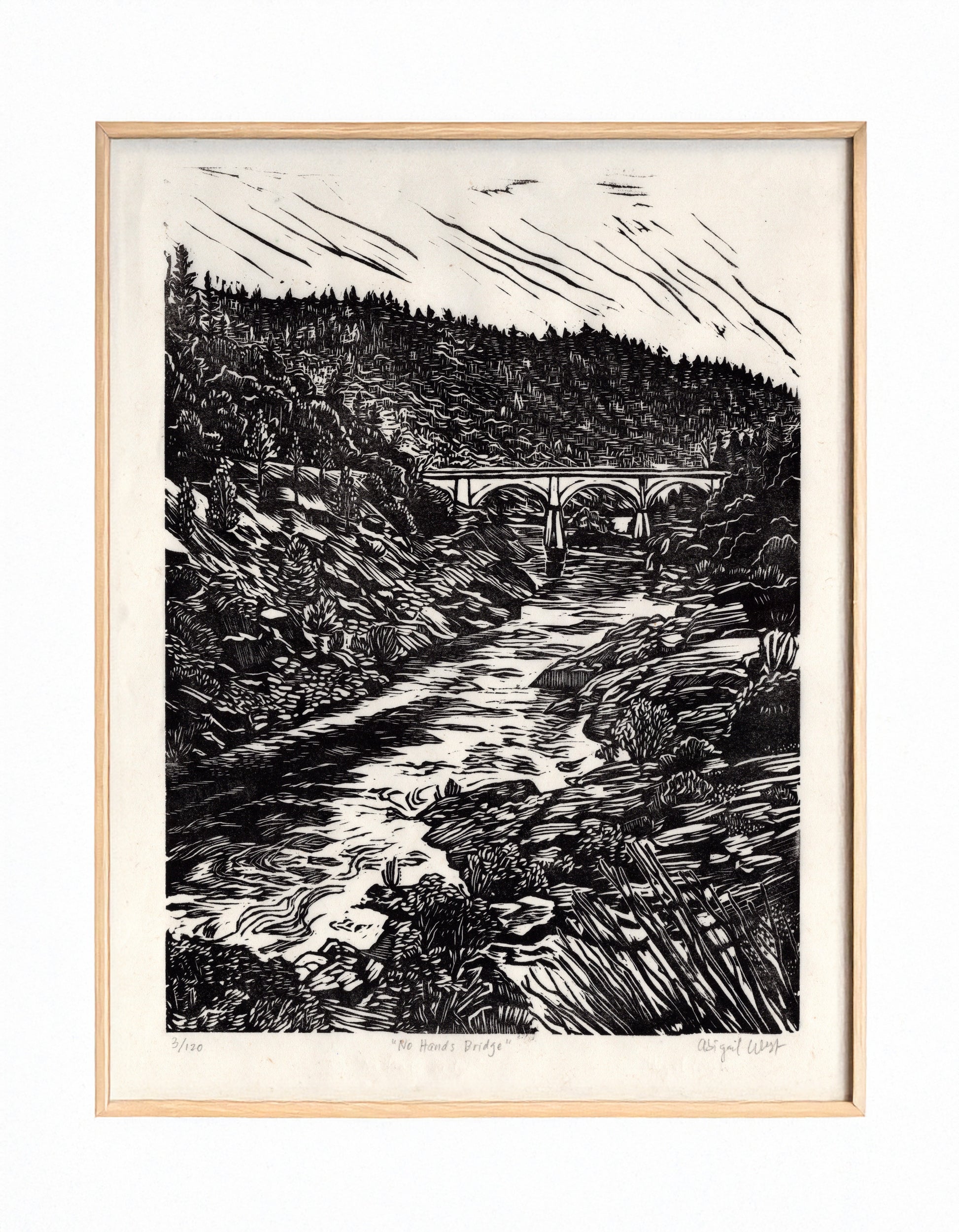 Hand-carved, hand-printed linocut block print of the iconic "No Hands Bridge" across the American River right outside Auburn, California. Runners of the Western States 100 cross No Hands at mile 96.5 of the race, and from there climb up to the finish line in Auburn.