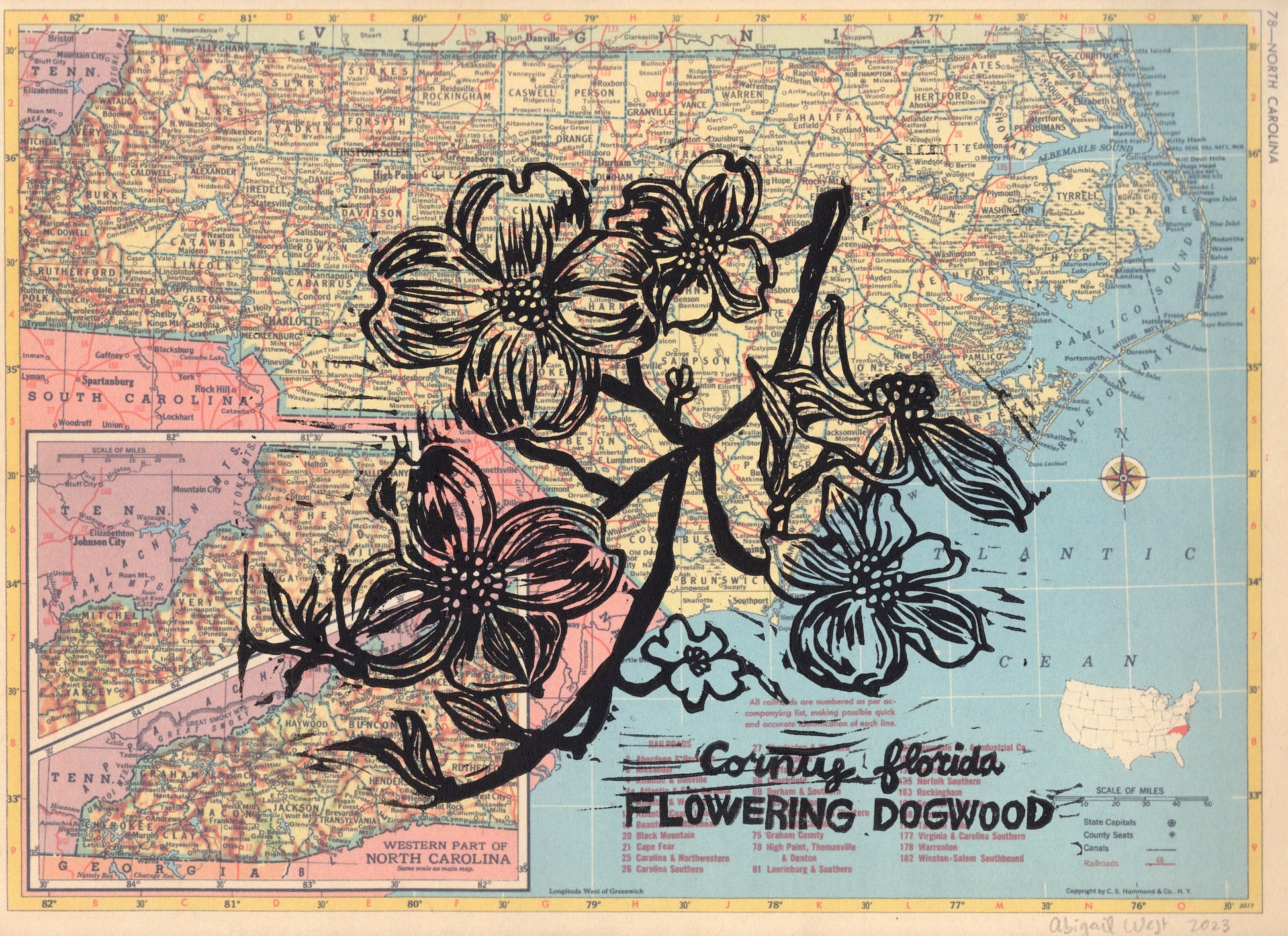 North Carolina State Flower - Flowering Dogwood Block Print on Map