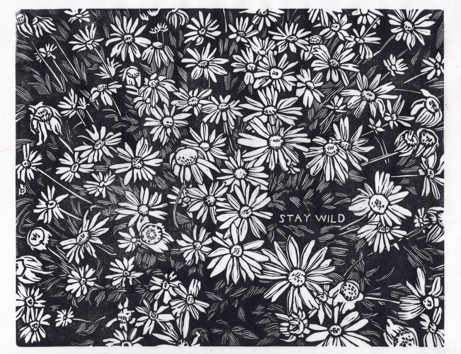 Hand-carved, hand-printed Linocut. Field of wildflowers, and a reminder to Stay Wild out there.