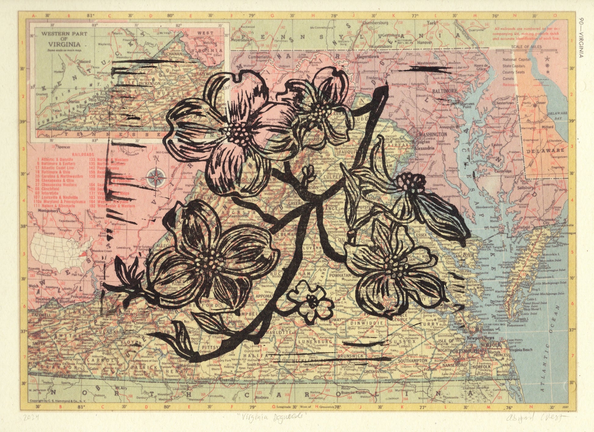 Hand-carved, hand-printed linocut on map of Virginia. Map is from before interstates, and shows counties, towns & railroad lines.