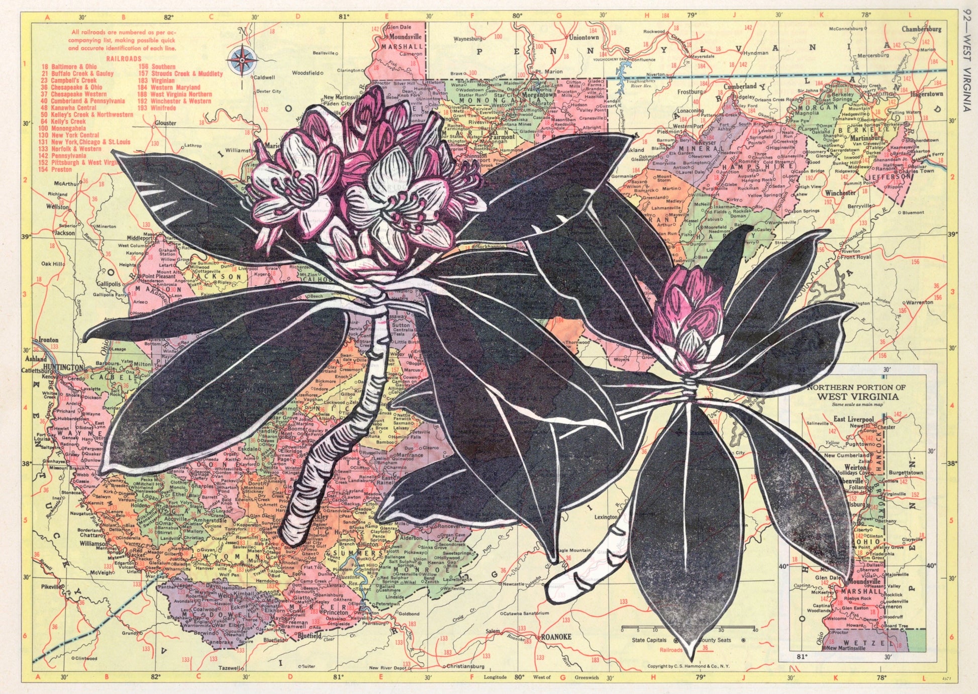 Hand-carved, hand-printed three layer linocut on map of West Virginia. Printed on paper made in the USA by French Paper Co.