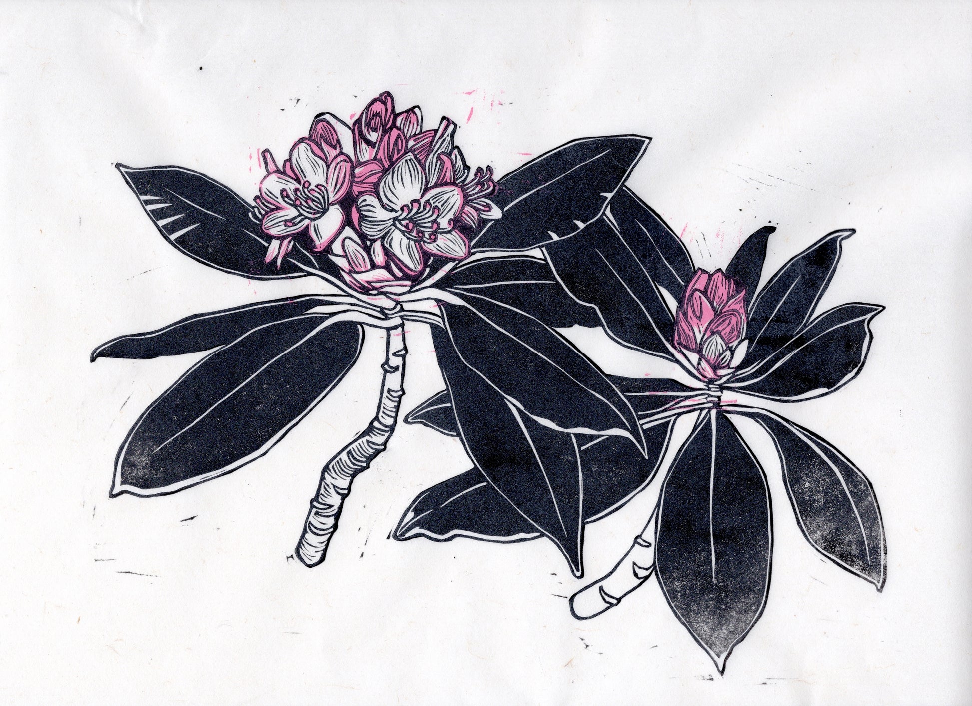 Hand-carved, hand-printed 2-layer linoleum block print.