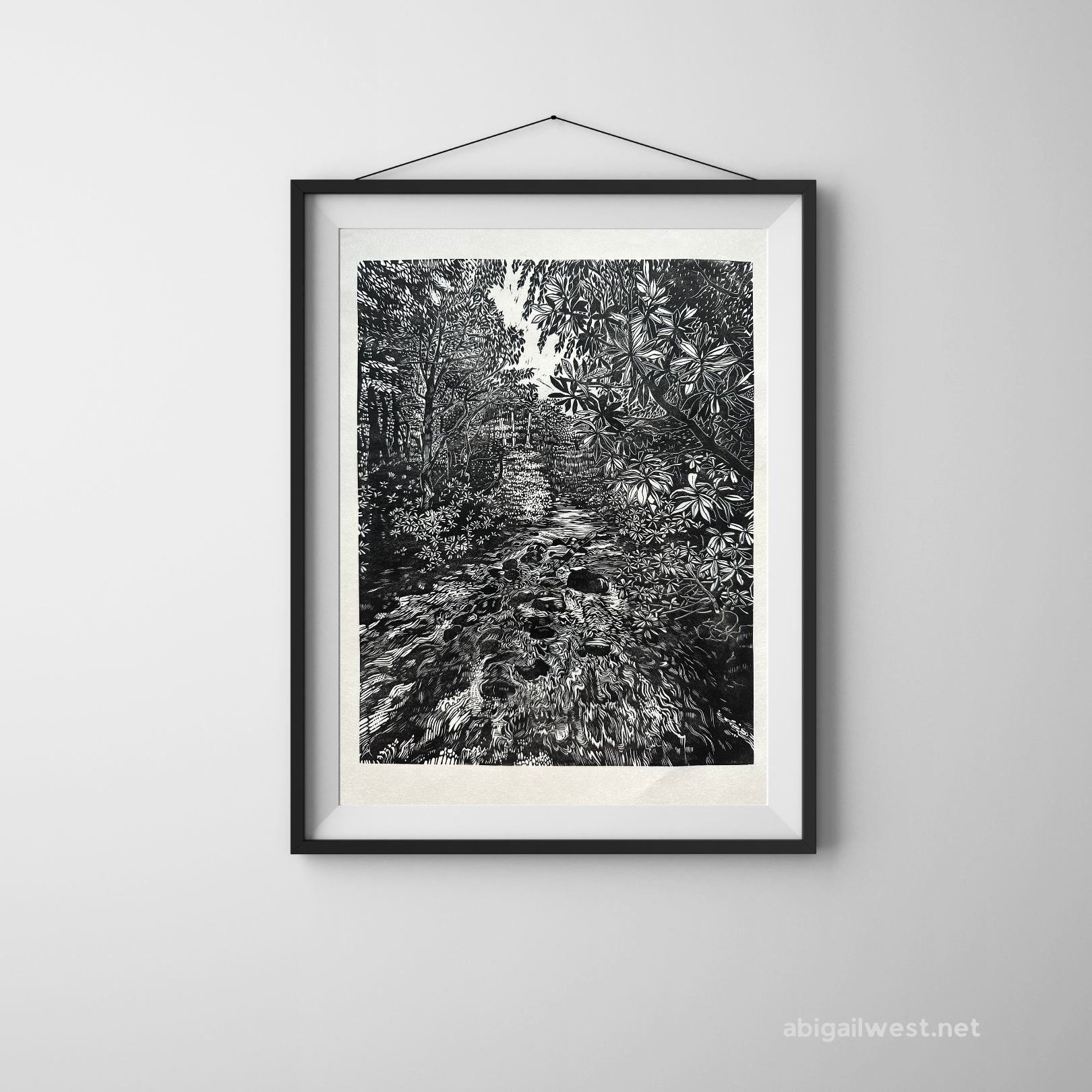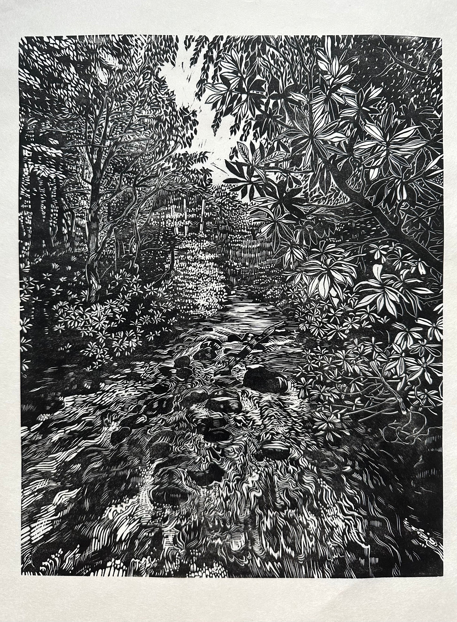 It’s a summer day in the Great Smoky Mountains National Park. The foliage is as lush as ever and the rolling stream is there to cool you off with that fresh mountain spring water. This hand-carved, hand-printed linocut depicts the Great Southern Rainforest, one of the artist’s favorite places on earth.