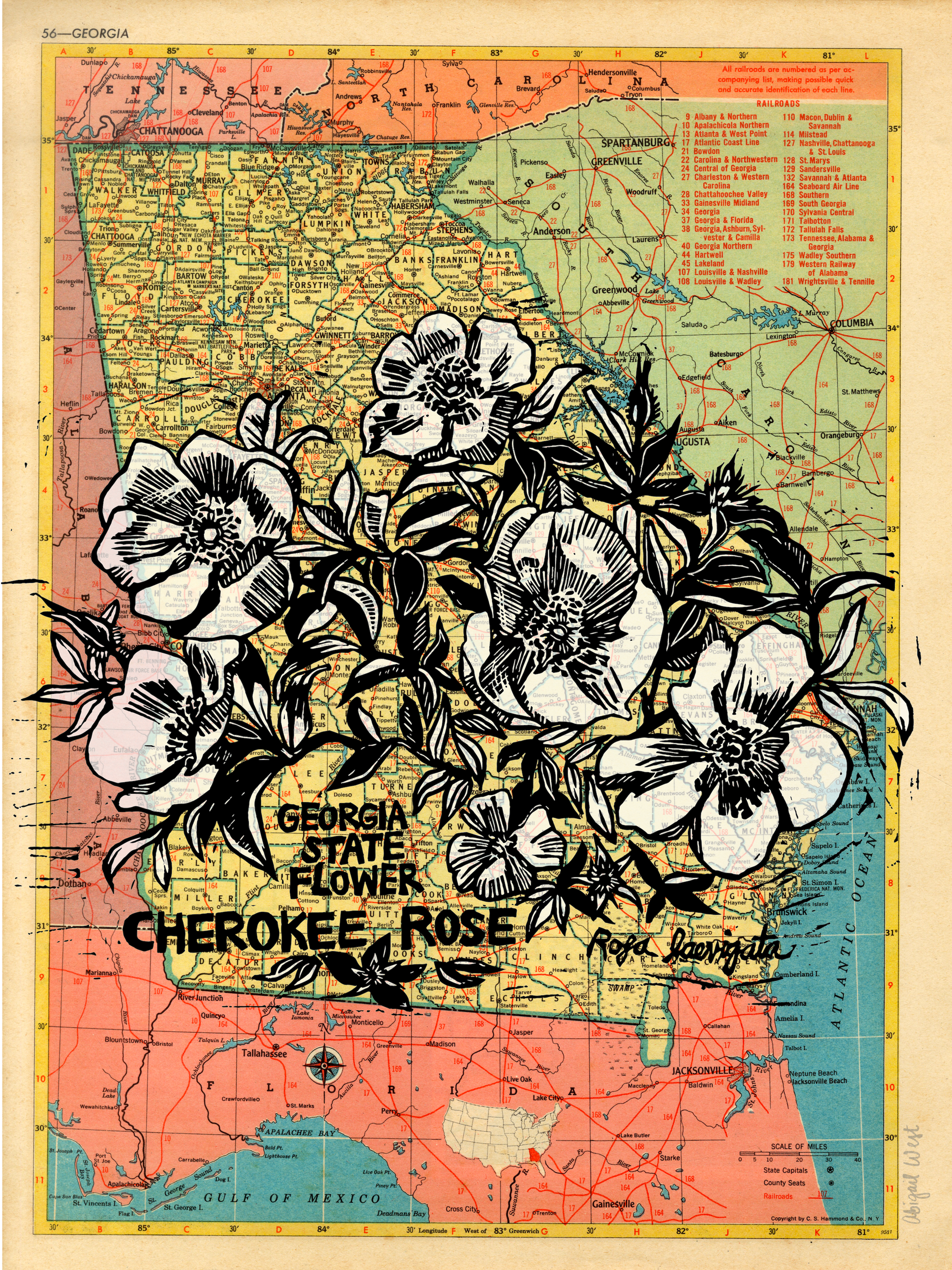 Two-block print of a Cherokee Rose, Georgia’s state flower. 9x12. Hand-printed on a map of Georgia’s railroad lines from the mid 20th century.