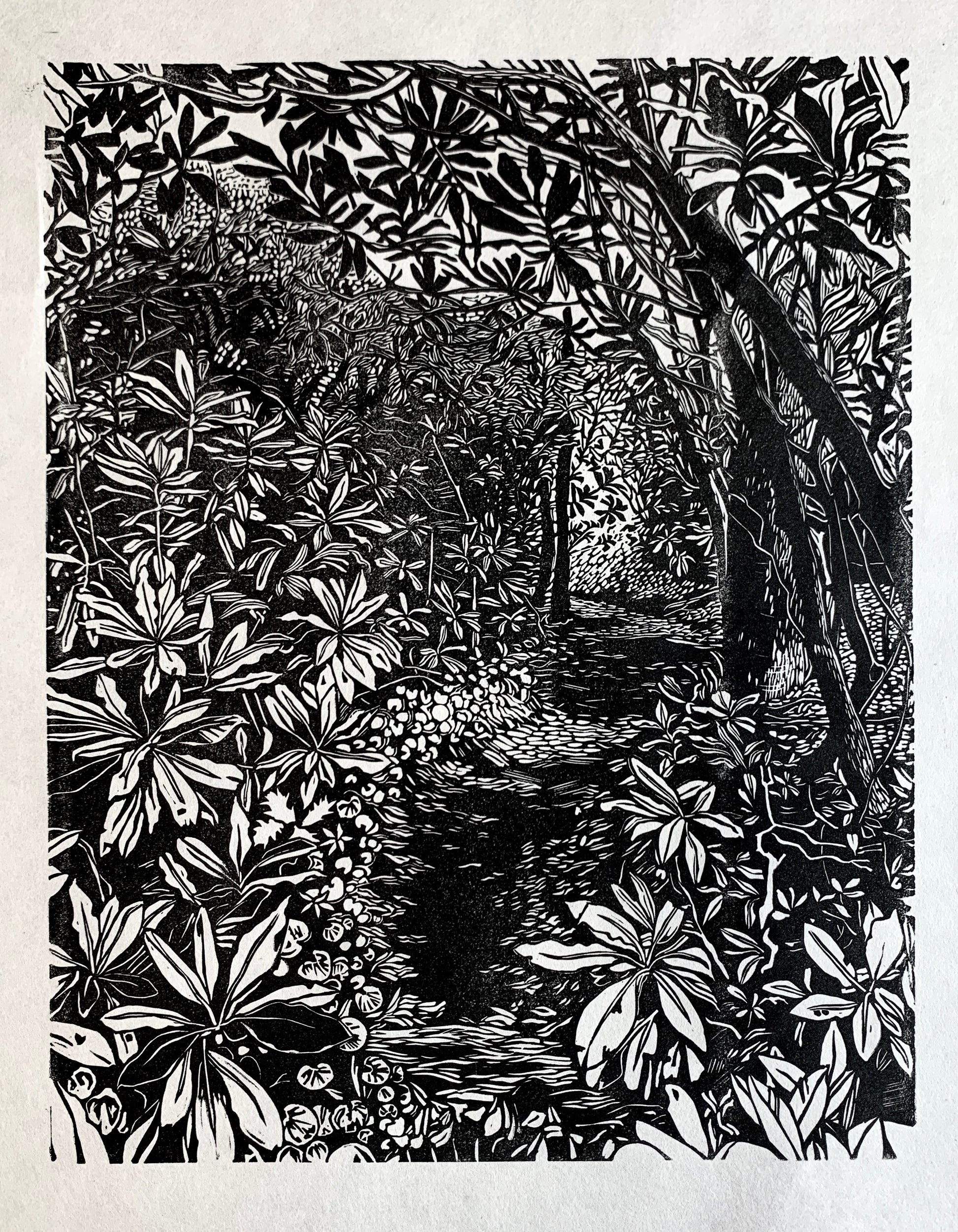 Hand-carved linocut of a summer day on the Bartram Trail in the Blue Ridge Mountains, somewhere between Warwoman Dell and Rabun Bald in Georgia. It’s a scene iconic to the southern end of the Appalachian Mountain range, rhododendron and mountain laurels arching over the trail, filtering through dappled sunlight.