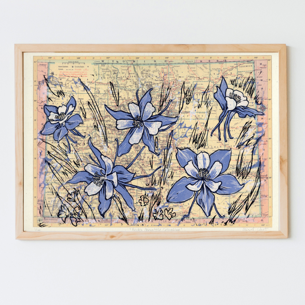 Hand-carved, hand-printed three layer linocut on vintage map of Colorado. Rocky Mountain Columbine is the CO state flower. Printed on paper made in the USA by French Paper Co.