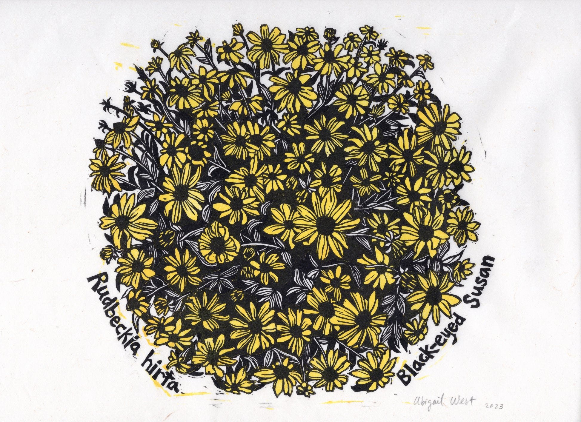 Hand-carved, hand-printed two layer block print, of a beloved long-lasting wildflower, the Black-Eyed Susan.