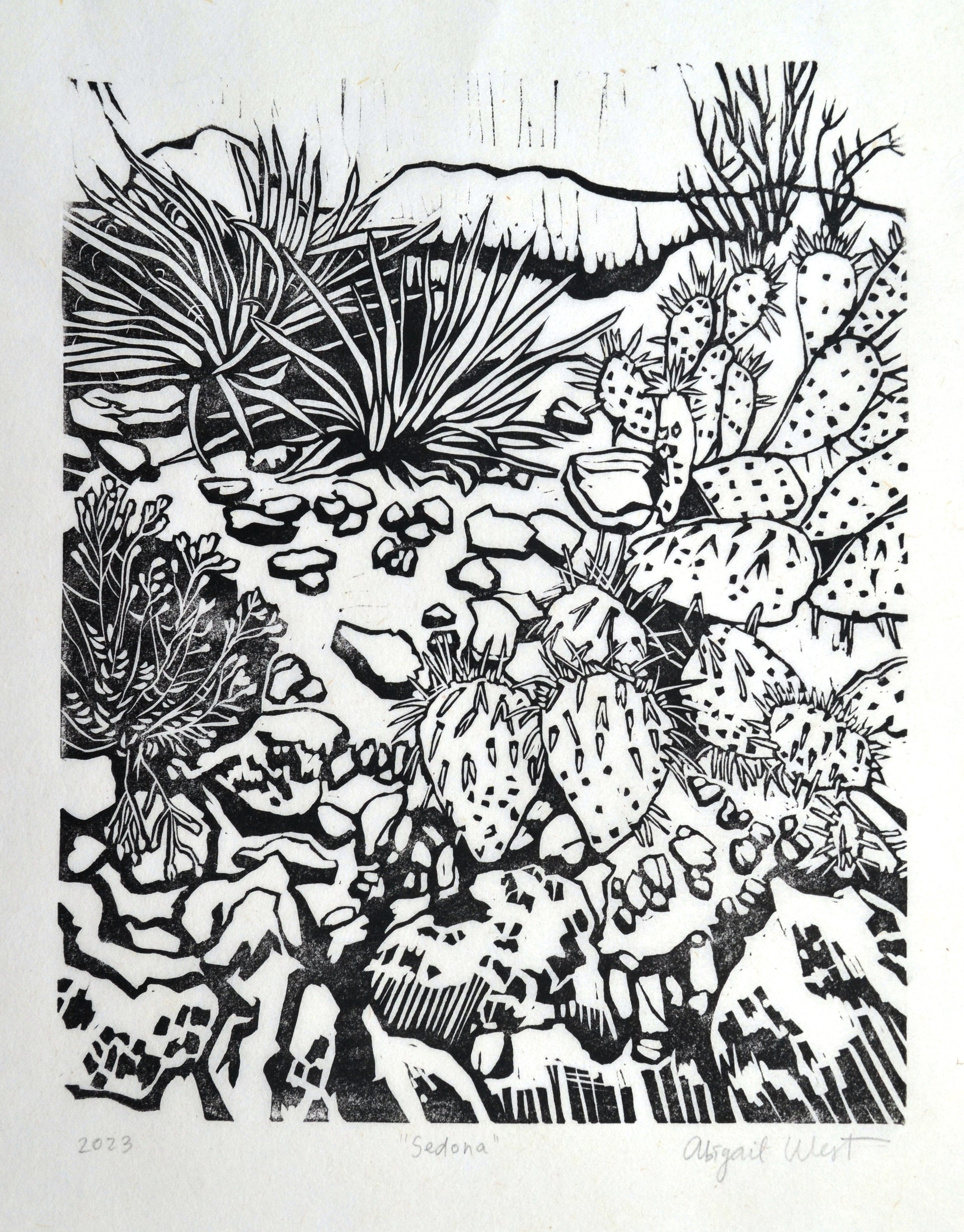 Landscape inspired by the rocky yet vibrant terrain by the trail in Sedona, Arizona. Abigail made this print after running 100 kilometers through the desert in Arizona on the Black Canyon Trail, while the desert was still freshly emblazoned in her mind.