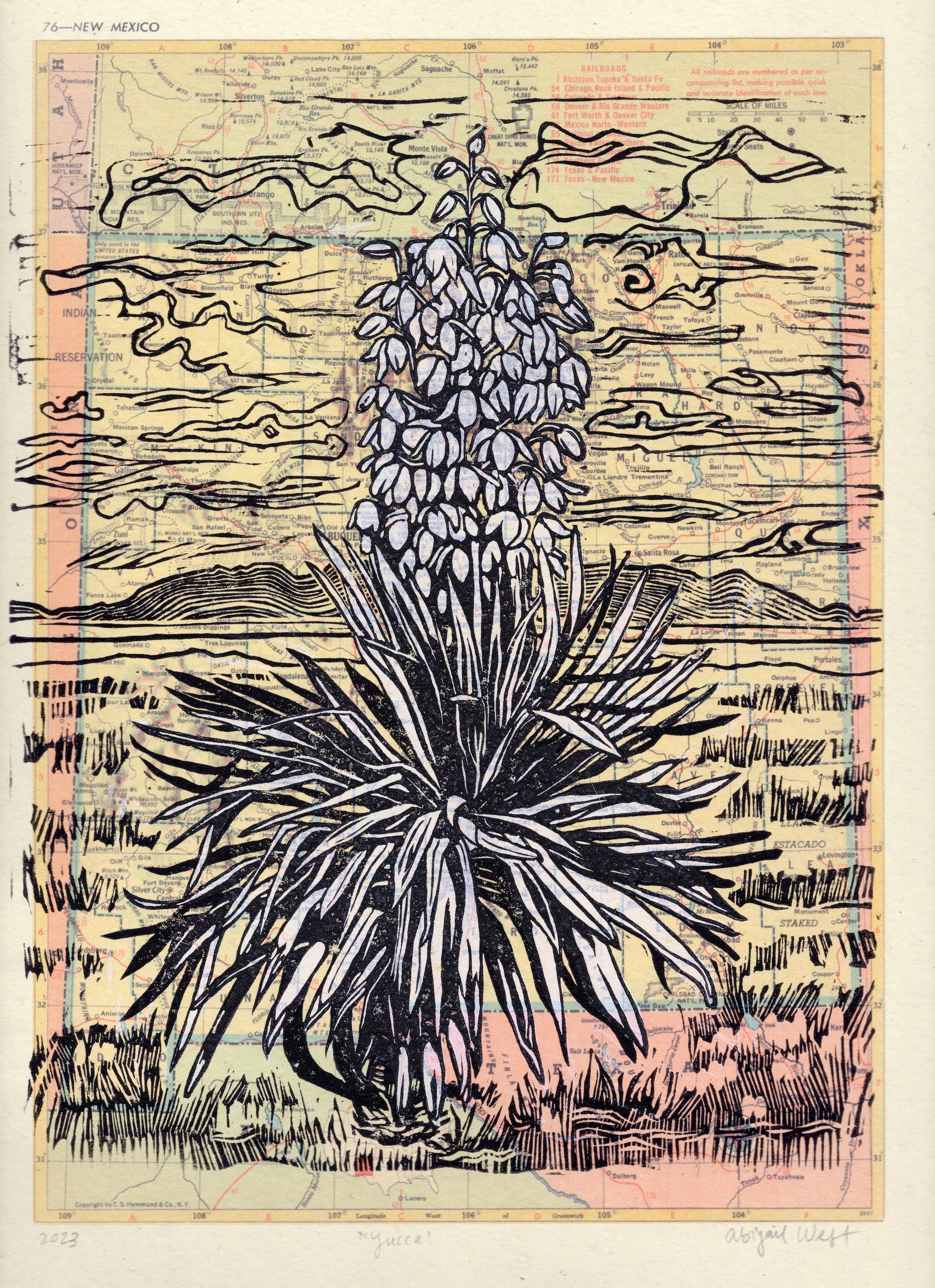 Hand-carved, hand-printed two layer linocut on map of New Mexico. Printed on paper made in the USA by French Paper Co.