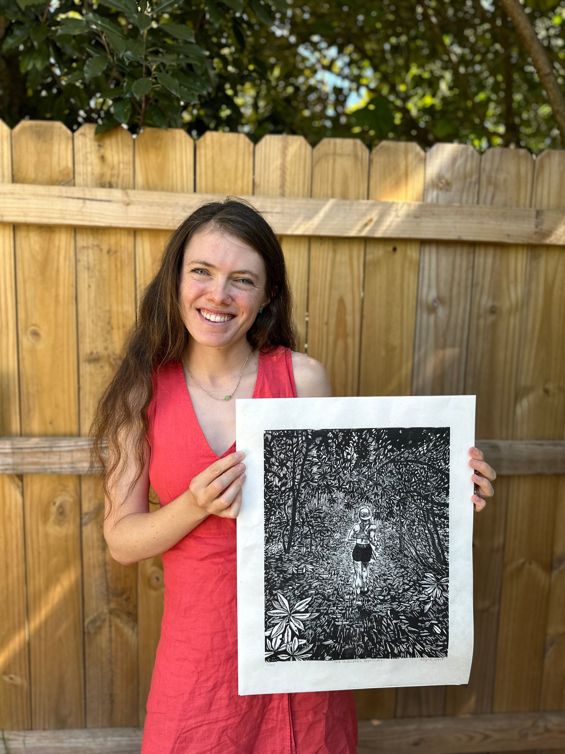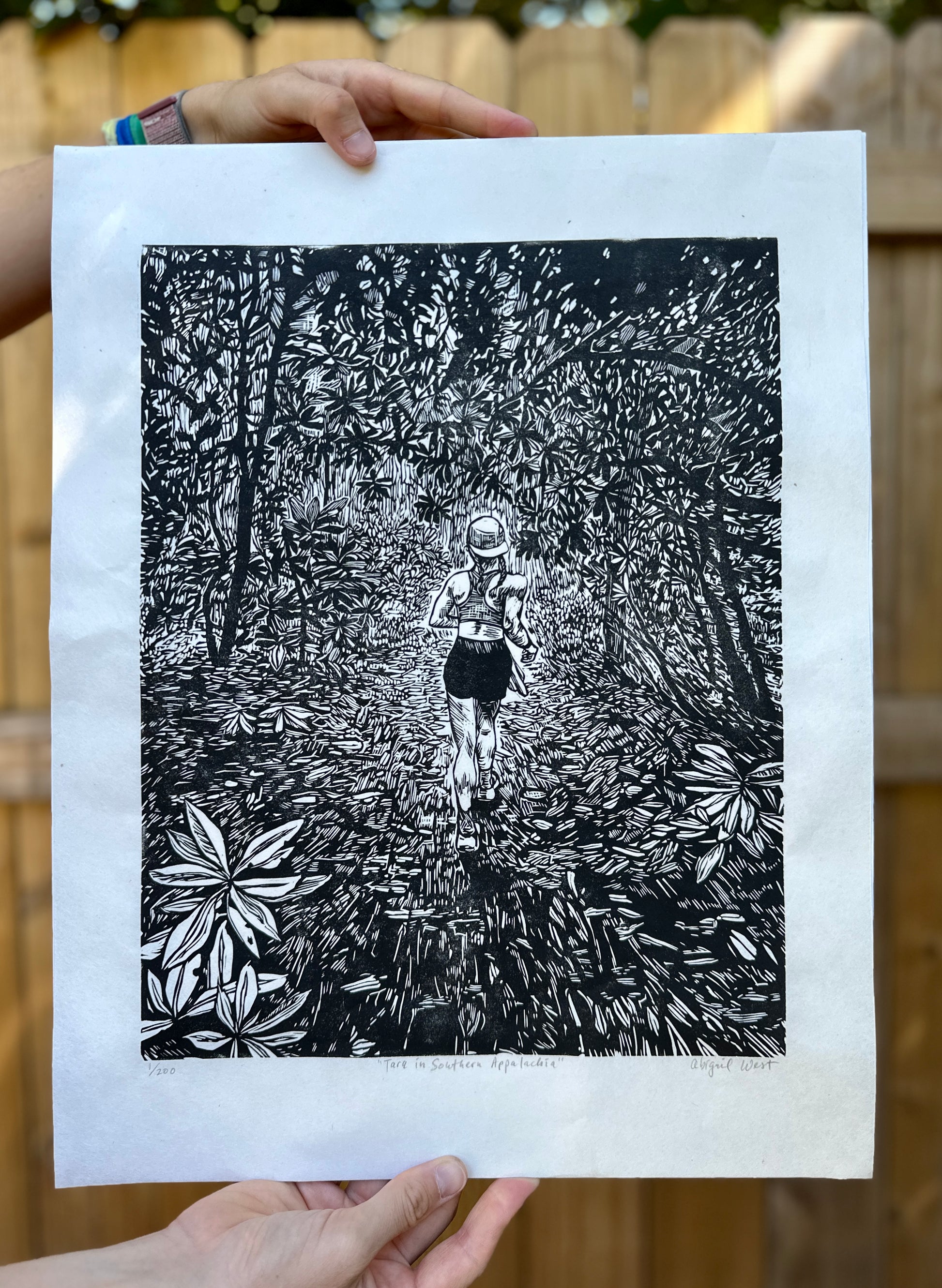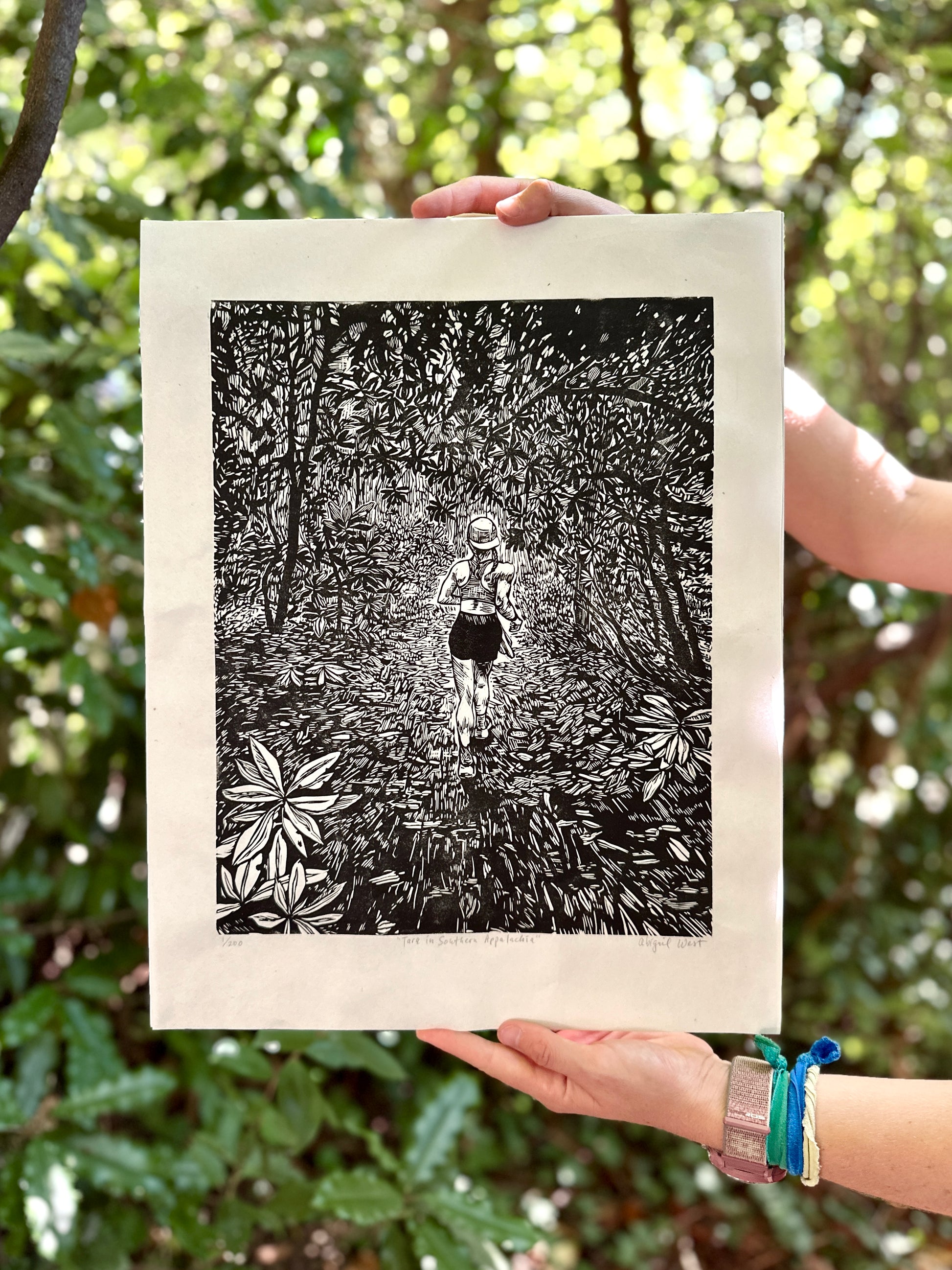 A mere five days after Tara successfully broke the record, Hurricane Helene struck our beloved Southern Appalachia with shocking force. I had already talked to Tara about the idea of doing this print, and it quickly became apparent that we could leverage my skills as an artist and Tara’s legendary feat to raise money to support hurricane recovery.