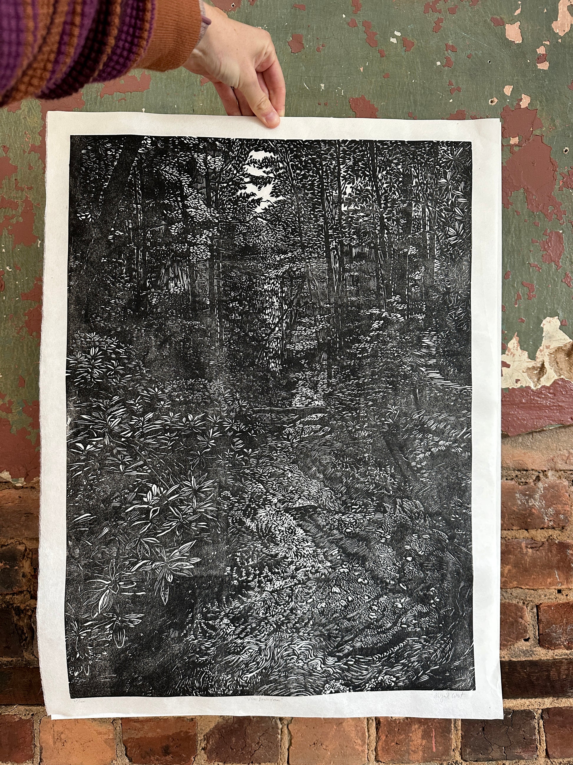 16x22” image size, 18x25” paper size. Hand-carved linocut. Printed on Thai Kozo.